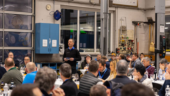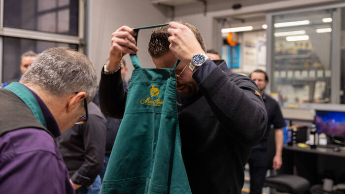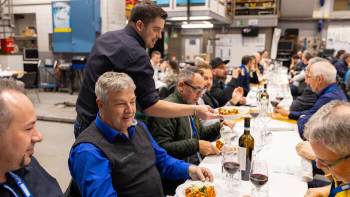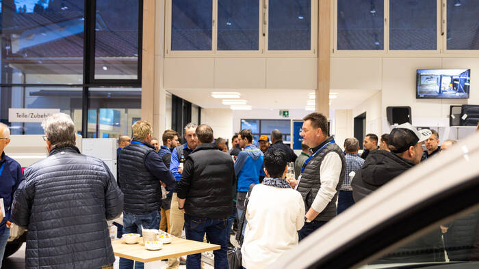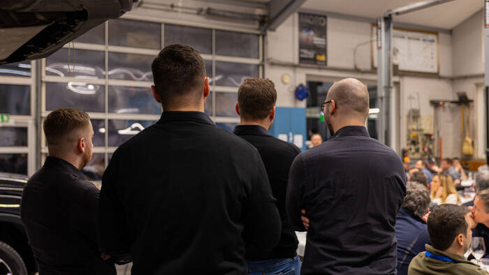 Der Büetzerabend spielte sich nicht an einem Ort ab, sondern bewegte sich durch das ganze Haus. Gespräche entstanden dort, wo sonst gearbeitet wird. Ein gemeinsames Anstossen im Showroom bildete den Auftakt, danach verlagerte sich der Austausch in die Karosserie & Lack Abteilung und weiter in die Werkstatt. Zwischen Fahrzeugen, Werkzeug und Hebebühnen wurde gegessen, diskutiert und zugehört. Gegen Ende des Abends kehrten die Gäste in den Showroom zurück, wo das Dessert serviert wurde. Im Vordergrund standen der persönliche Austausch, offene Gespräche und echtes Interesse und Begegnungen auf Augenhöhe.